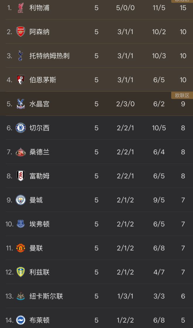 在此前结束的本轮比赛中,卫冕冠军利物浦在主场2-1力挫同城死敌埃弗顿,开局5连胜强势领跑。尽管英超才开打5轮,但利物浦已经甩开了所有对手至少5分。