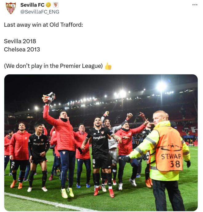 塞维利亚不仅特意点出切尔西这一尴尬纪录,更直接强调自身在该球场的取胜时间比对手更近。俱乐部在社交媒体上清晰列出关键数据:“最近一次在老特拉福德客场取胜:塞维利亚2018年,切尔西2013年”,还不忘补充一句“我们可不在英超联赛踢球”,暗讽切尔西作为英超球队却长期在曼联主场难以立足。