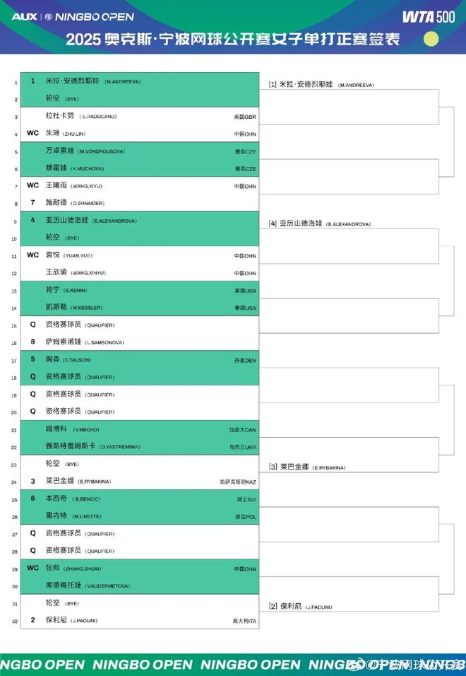 北京时间10月11日,爱奇艺体育将在10月13日起全程直播的WTA500宁波站正赛签表出炉。