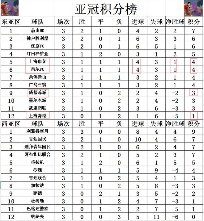 积分榜方面,神户胜利船昨晚在3球落后的情况下,连追3球,不过最后还是惨遭绝杀,2连胜被终止,这样的话他们就无力超过蔚山HD夺回榜首,2个净胜球优势,还是力压击败他们的江原FC排在第2,江原FC排第3。申花击败首尔FC拿到赛季首胜后,追上首尔FC,两队进球,净胜球一样,并列第5,成都蓉城跌出前8。随着申花赢球,中超卫冕冠军上海海港成了3轮过后唯一没有赢球的球队,3轮仅拿到1分排名垫底。